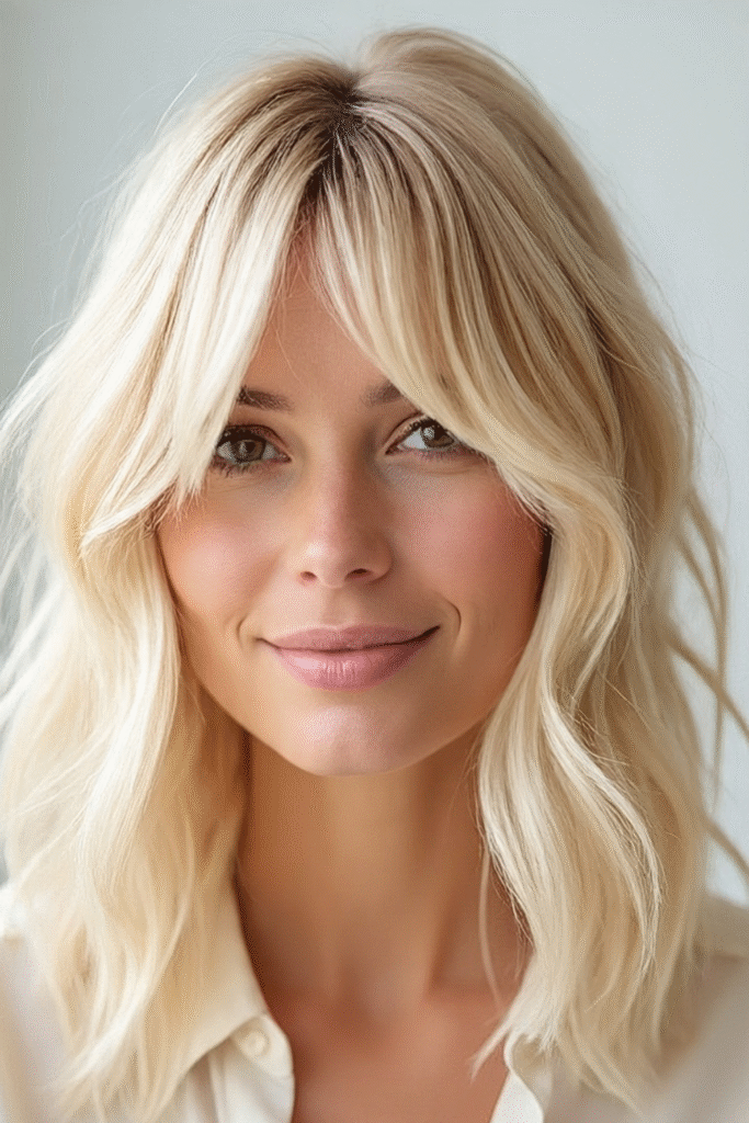 Les tons blonds éclatants associés à une frange rideau balayante créent un effet lumineux qui illumine le visage et met l’accent sur les dégradés texturés.