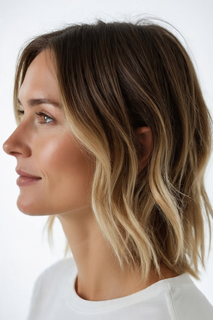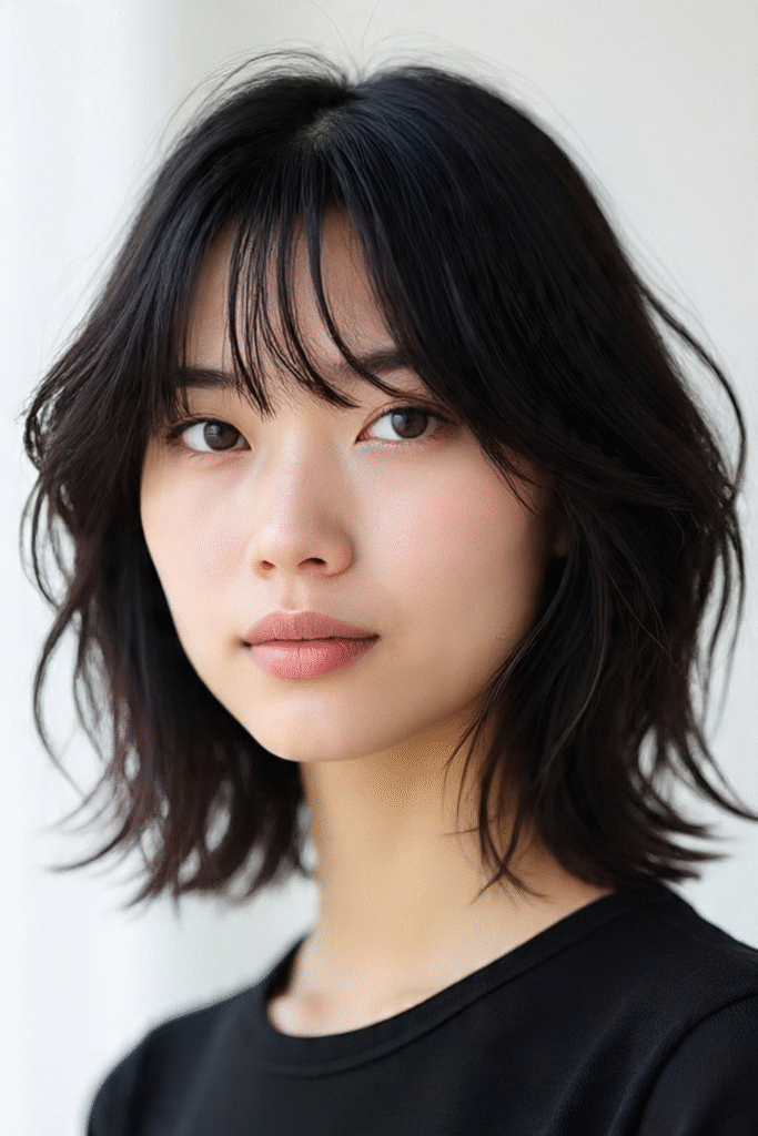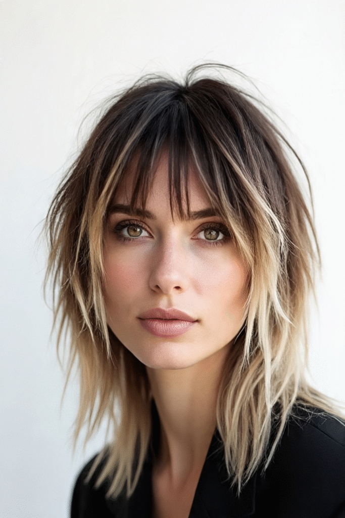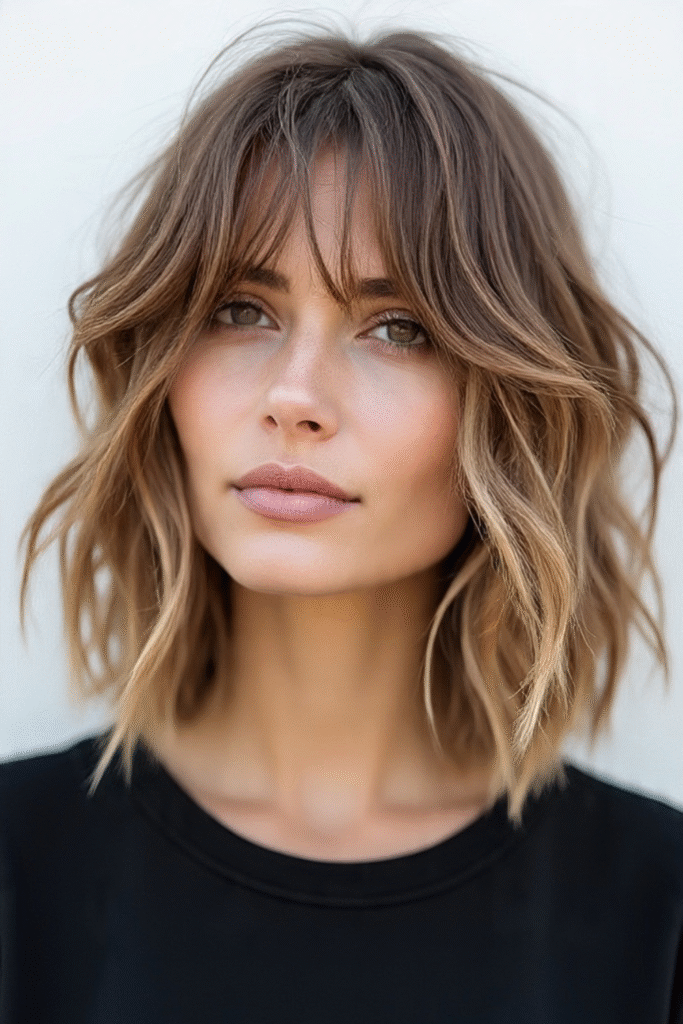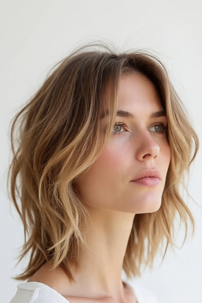 Cette interprétation contemporaine du shaggy lob embrasse l’imperfection et la texture naturelle, le rendant idéal pour celles qui veulent paraître soignées sans passer des heures sur leurs cheveux.
