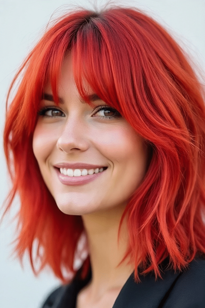 Une coloration rouge audacieuse associée à des dégradés hachés et une frange encadrant le visage crée un impact visuel maximum, en faisant un choix idéal pour celles qui recherchent une transformation dramatique.